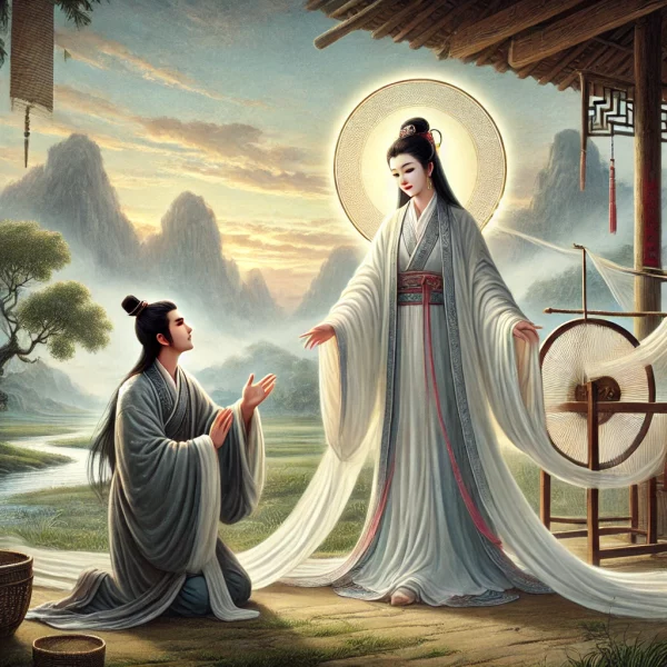 董永是漢代千乘人,年輕時失去母親,獨自照顧父親。父親去世後,他借錢安葬父親,無力償還,只能以身作奴。在途中遇到一位婦人,她願意成為他的妻子,共同償還債務。婦人織布一月,還清債務後離去,並告訴董永她是天上的織女,因董永孝心感動天帝,特來幫助他償債。