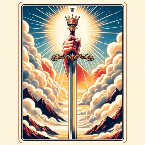 寶劍王牌(Ace of Swords)是塔羅牌中的一張小阿爾克那牌,象徵著新的開始、真理和清晰的思維。這張牌通常描繪一隻手從雲中伸出,握著一把豎立的寶劍,劍尖上常有皇冠或桂冠,象徵著勝利和成就。背景中常有山脈和風,象徵著思想的高度和行動的力